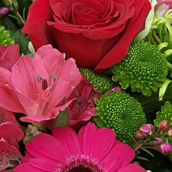 This gorgeous bouquet features; red rose, wax flowers, germini's, carnations, astromeria, lisianthus, spray carnations and chrysanths, all brought together with seasonal greenery and a complementary burgundy satin bow.