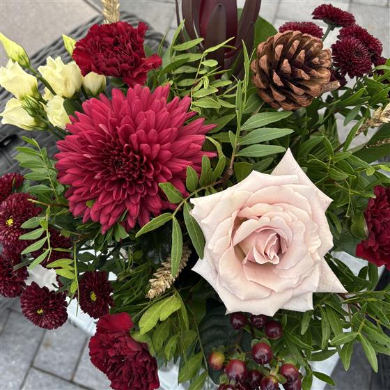 Introducing our 2025 Christmas Vase. The perfect festive bouquet of flowers presented in a classic vase. A stunning mix of seasonal blooms and festive tones to make the most gorgeous and unique Christmas gift.