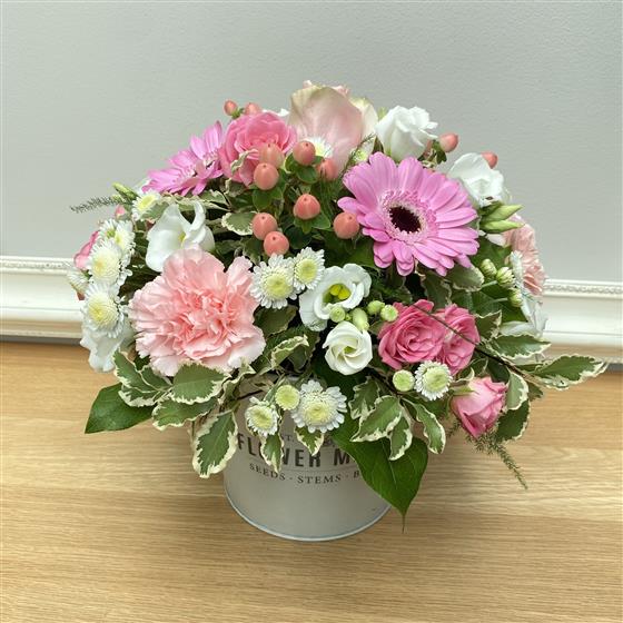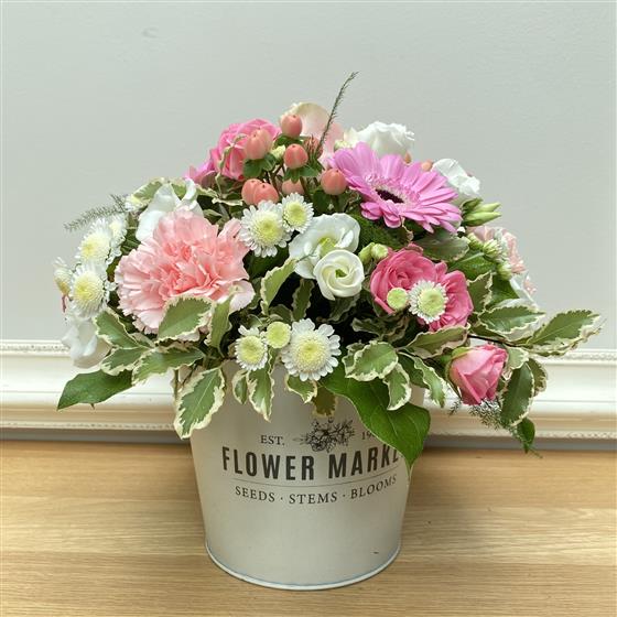 An absolutely stunning and rustic reusable pot filled with pastel inspired shades of rustic pinks, creams and green.